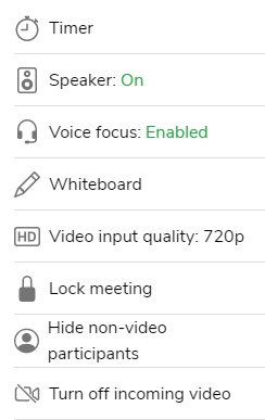 All of your meeting controls are listed across on the video conferencing screen. See below for an explanation of each of these features.