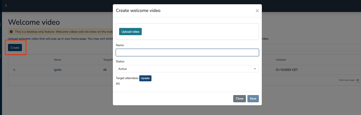 Upon going into welcome video, simply select ‘create’ & upload your MP4 video content. To ensure that it’s live on the platform select ‘active’. Any welcome videos which aren’t activated, won’t be seen live on the front end.