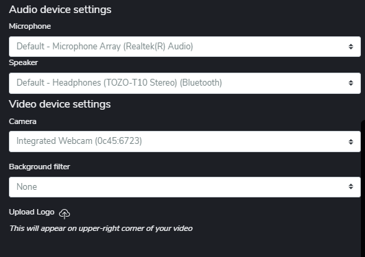At the start of every call, a readiness checker will appear on screen. Here you can select the appropriate microphone, speaker and camera (you are also able to select the quality of your webcam). You’ll also find the options to add a background filter & upload your business’s logo.