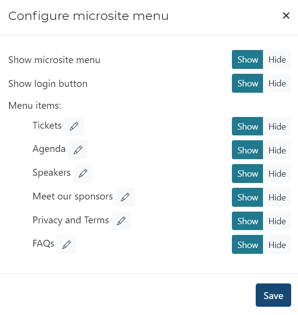 You can rename sections such as Tickets, Agenda, Speakers, Meet our Sponsors, and Privacy and Terms in the Microsite if you’d like.