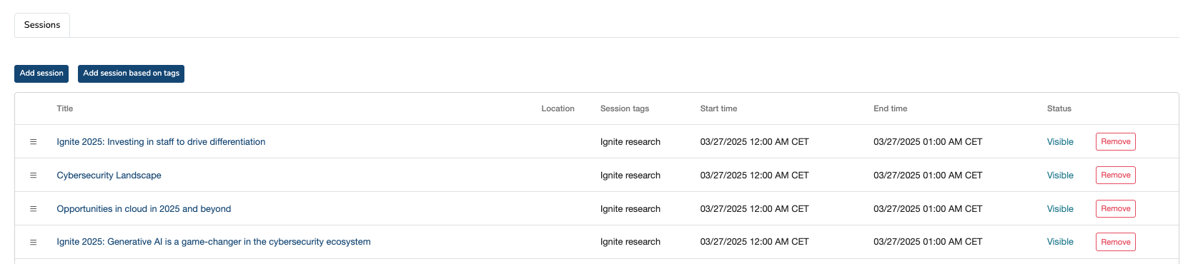 Select save and click back into the newly created playlist to pull through your sessions. Find the sessions tab at the bottom of the page, select add session and tick the sessions you wish to pull through to the playlist. The sort functionality here (three line icons beside the session name) helps you to define the order of sessions within each row.