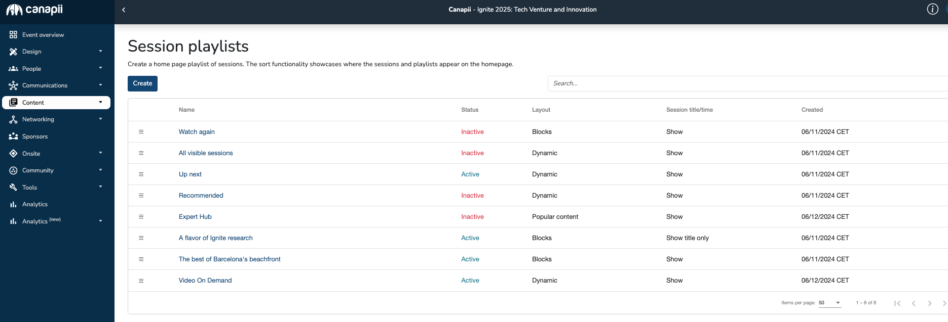 Once you have sessions, go to Content > Playlist tab and on this page, you’ll find a default playlists: All visible sessions,  Watch again, Up next, and Recommended . These are auto generated by the system but you are free set the playlist as active or inactive as needed. You can also create new playlists easily by clicking on the Create button.