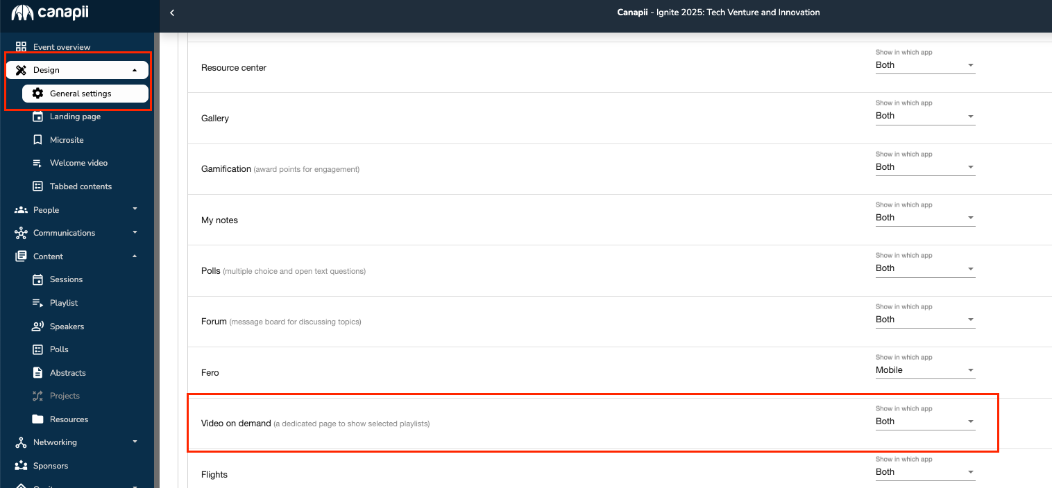 – Video on demand – Playlists which are only visible within a VOD page. Please note that the Video on demand page needs to be enabled under Design > General Settings > Pages as shown below: