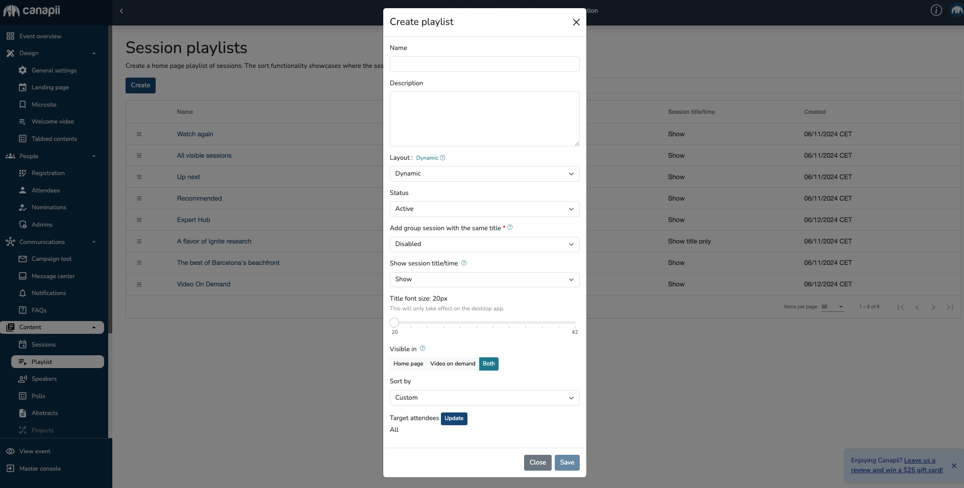 Playlists appear as rows on the event homepage and are made up of sessions. Before you begin to create playlists, you must create your sessions first under Content >  Sessions tab.
