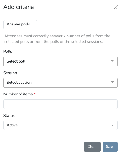 - Answer polls – Attendees must correctly answer x number of polls from the selected polls or from the polls of the selected sessions.