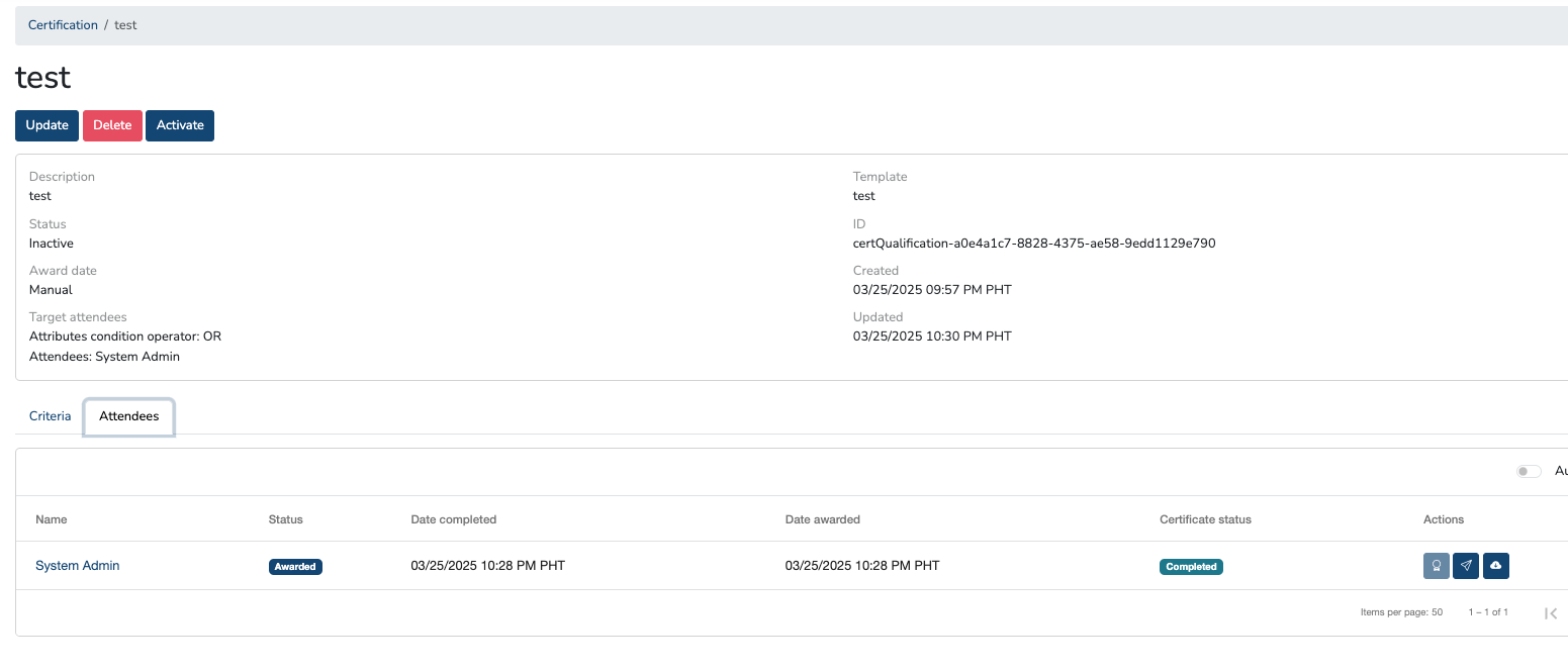 Once the qualification and criteria are created, admins will be able to see the status under Certification > Qualification > Attendee Tab