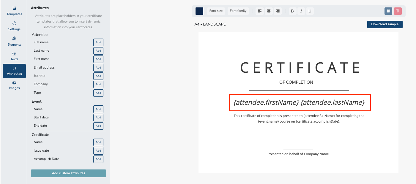 Attributes, on the other hand, refers to the placeholders in your certificate templates that allow you to insert dynamic information into your certificates based on attendee data and information. Additionally, adding any images are also possible by uploading it under Images.