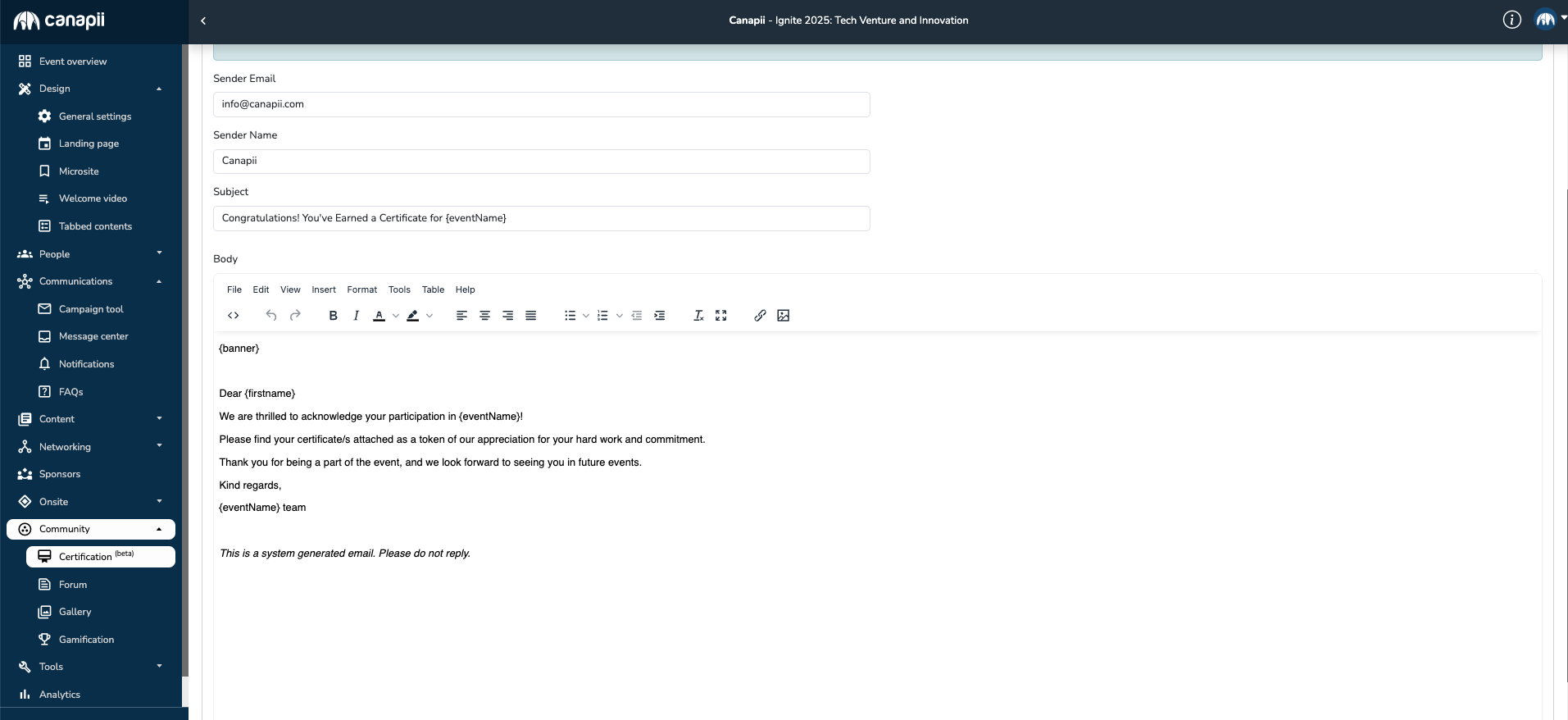 Certificates will be sent out to the attendees’ registered email address depending on the criteria and award date selected. The certificate file will be attached to an email notification and organizers are free to update the email content by accessing Certification > Template > Email Template.
