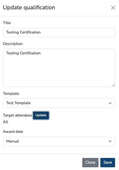 - Manual – manually award certificates to attendees once criteria is completed by clicking the award button on the Qualification > Attendee tab