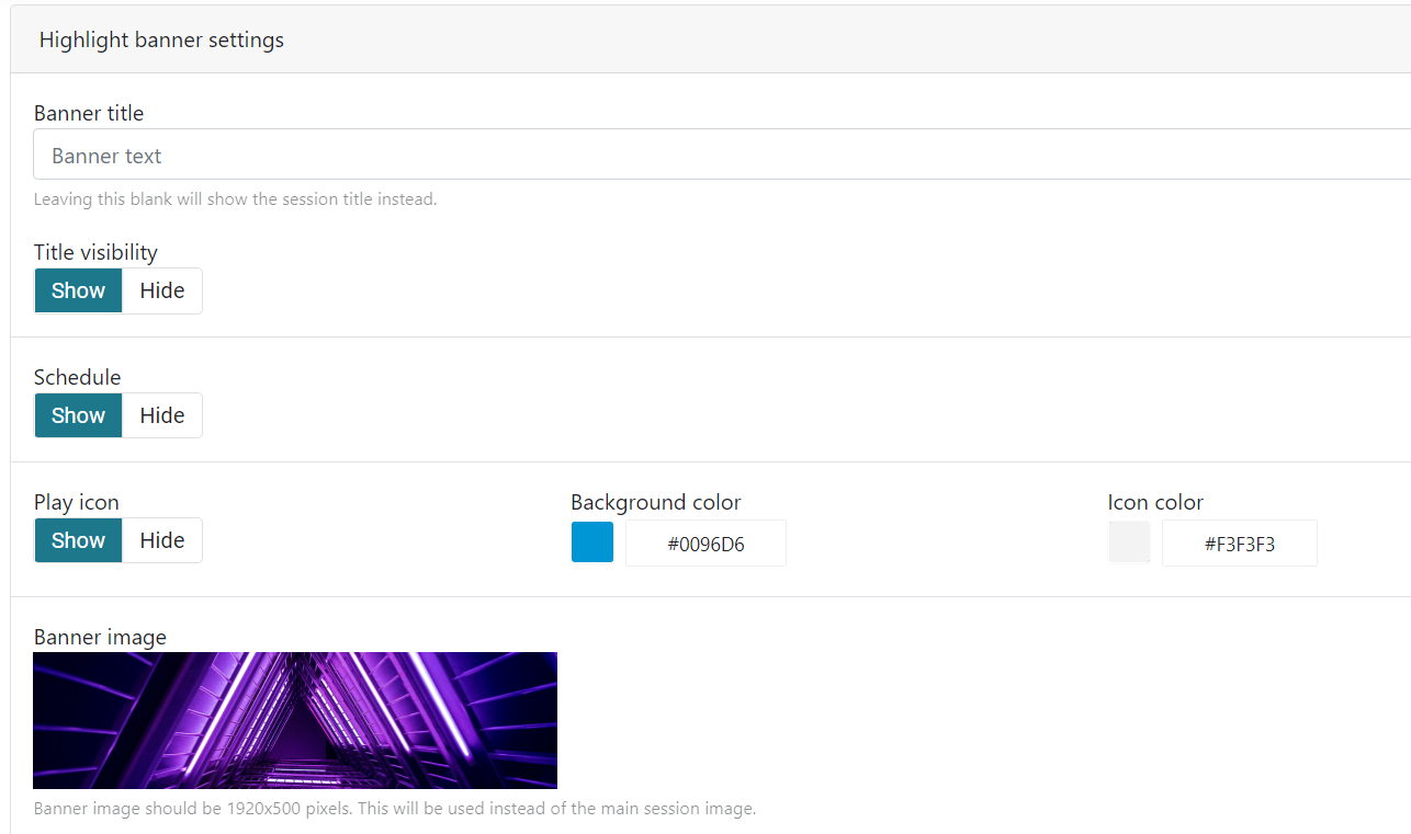 If multiple sessions are set to a highlight or secondary banner, they’ll appear as a rotating loop on the front end. To ensure that your users aren’t waiting for the loop to start from the beginning, we suggest that up to 3 showcased sessions is perfect & with a maximum of 5 if required.