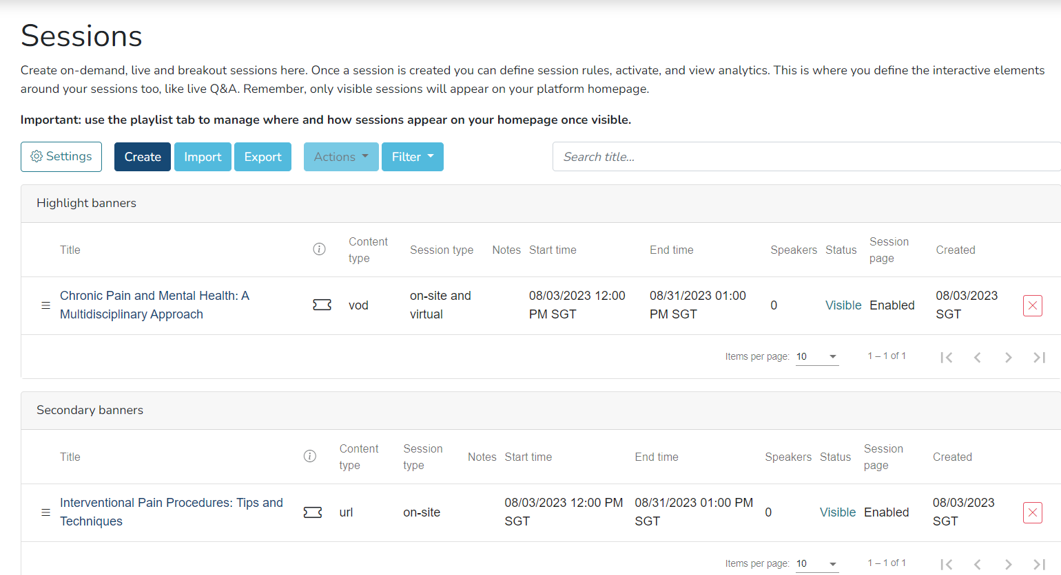All your highlighted and secondary banner sessions will appear be listed under the Highlight banners and Secondary banners section in Session page respectively.