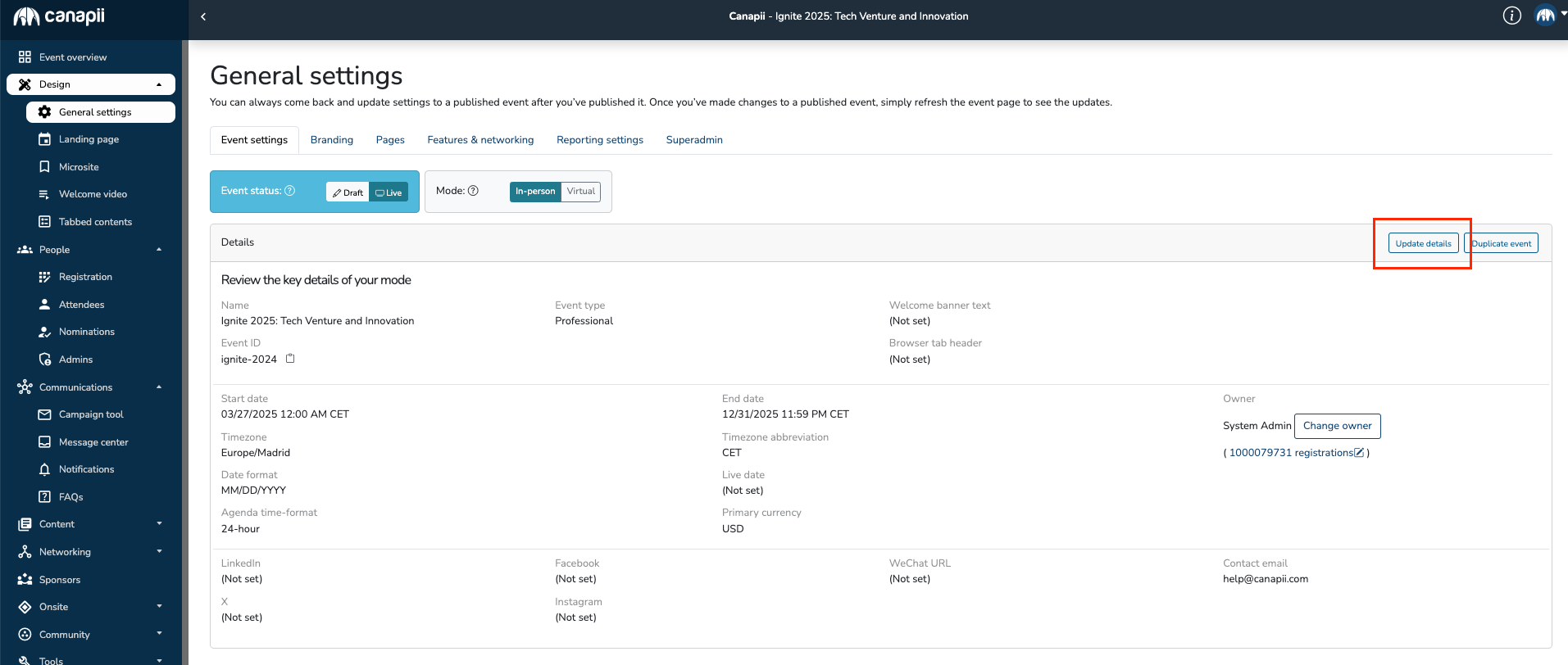 Under Design, select the General Settings then Event Settings tab and within that page, you may select the Update Details button that would allow you to review and update the following information:
