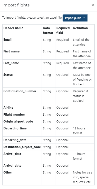 • As an admin, you’re firstly required to mass import attendees flights information. If an information is left blank on import, it will show “N/A” on the platform.