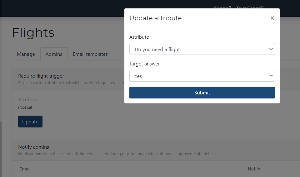 • Admins: Within the admins tab, you’re now able to select a custom attribute that will trigger an email notification. If the trigger is selected, event admins will receive the notification to inform that that further action is required. Please see the example below: