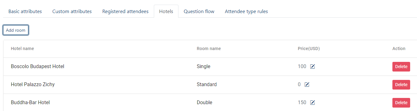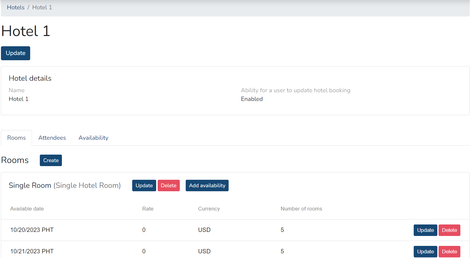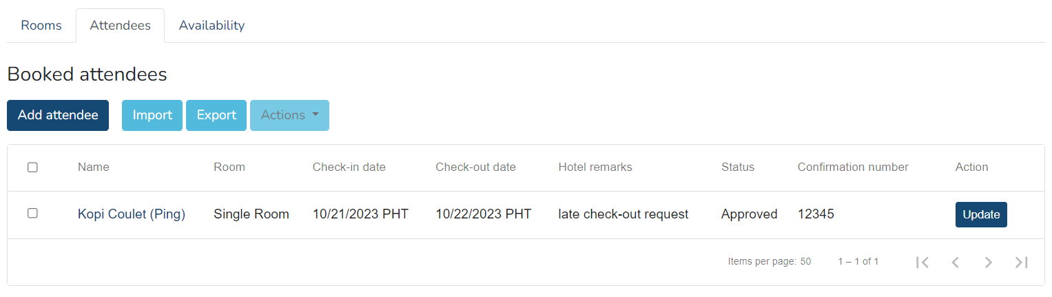 6. Next to the Rooms tab, you’ll find the Attendees tab. Within this area, you’ll find a list of attendees which have booked into the hotel and additional information will be presented such as the room type and the duration of their stay.