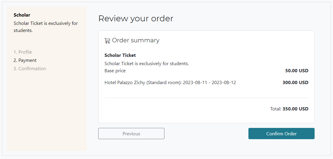 When they’ve chosen to add a hotel room to their purchase, their checkout screen will also reflect the new price:
