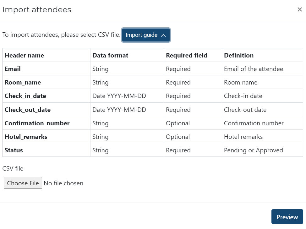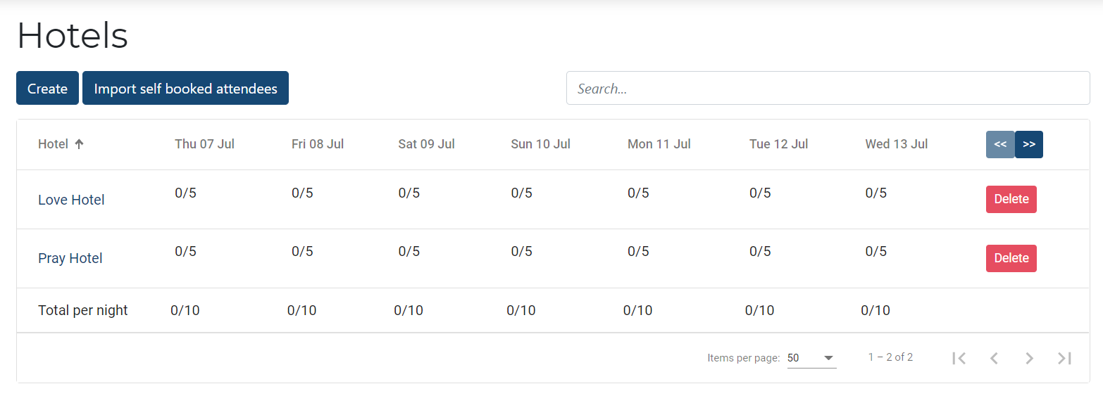 Simply click on Import self booked attendees and you will be able to upload a csv file of the hotel bookings of your attendees.