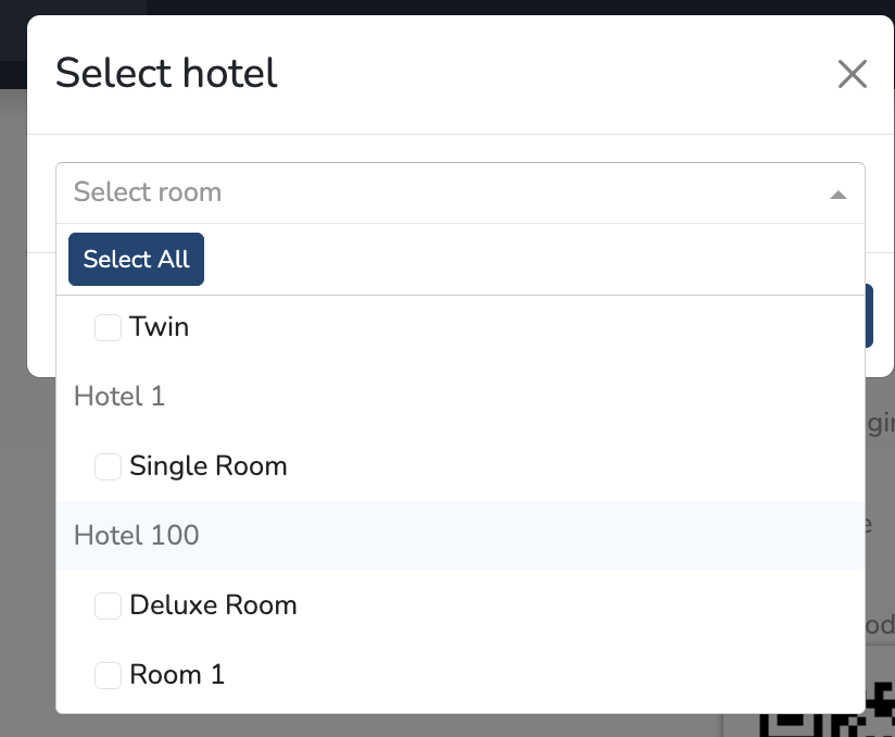 - Select the hotel and room. Note that you can select multiple rooms. The rooms selected here are the hotel and room options your attendees will see during registration.