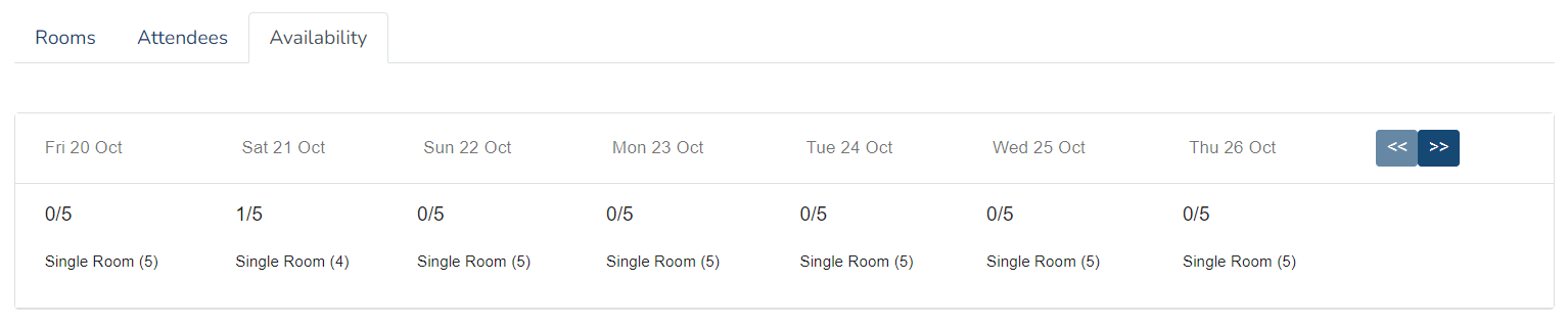 7. Availability: You’ll also find an availability tab which provides detail around the number of rooms booked and which rooms are still available on certain dates. The color coding provides further information around whether the rooms are fully booked, whether there is limited availability or plenty of availability left for your attendees.