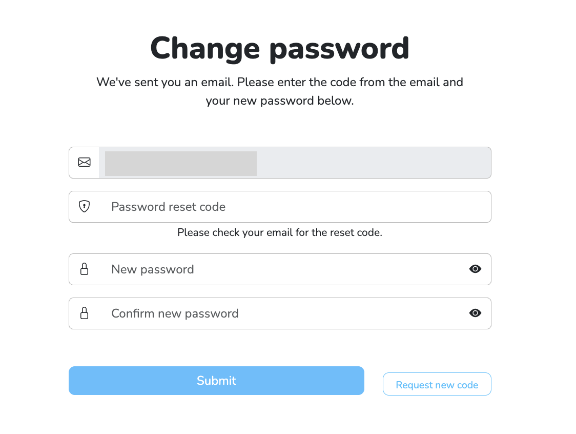 4. When you’ve received your six-digit verification code, input it into the Password reset code field, then enter and confirm your new account password into the New password and Confirm new password fields: