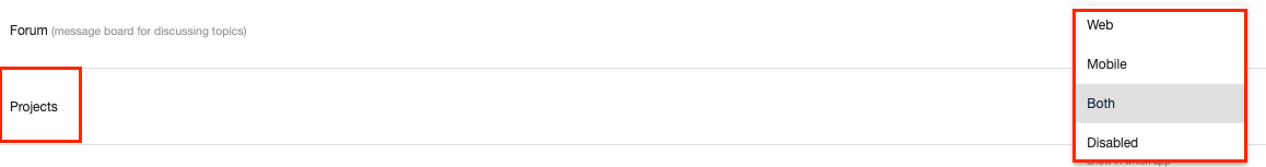 To setup, enable the Projects feature in the General Settings > Pages > Access. Admins may choose to select if they want to enable it either on Web, Mobile or Both.