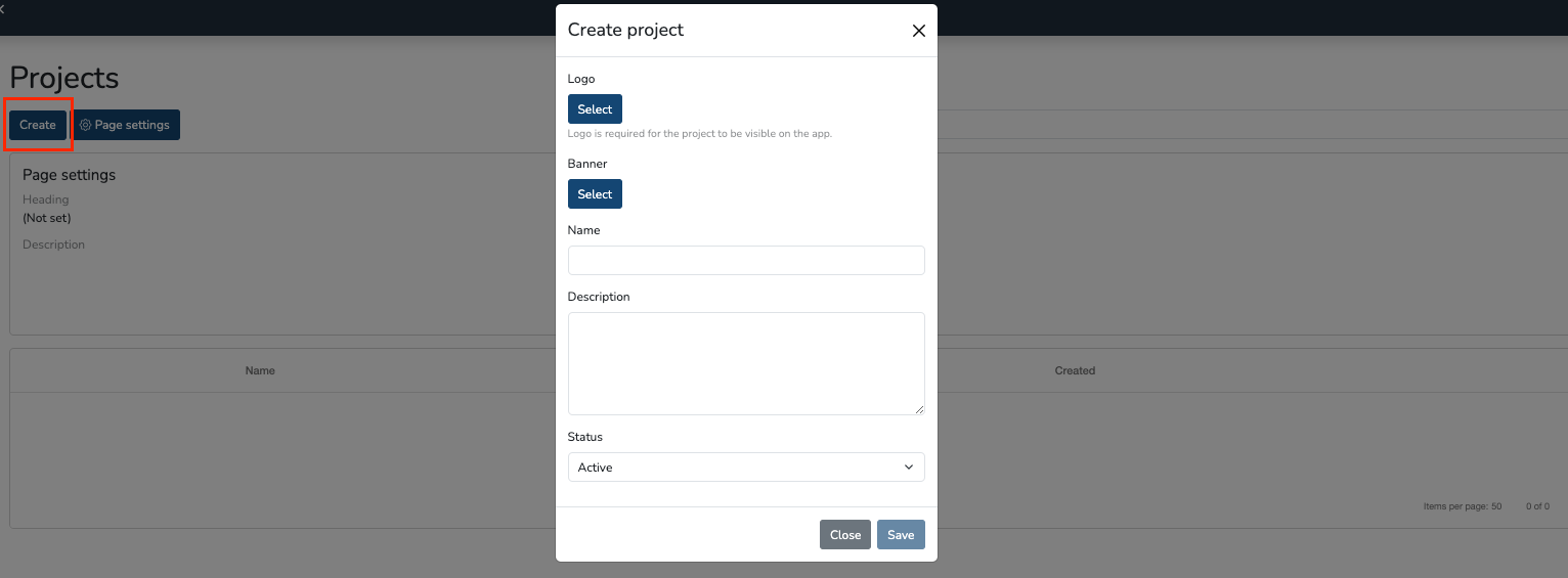 Insert the Project Logo and Banner photos as well as the name and description. Set the status to Active to ensure that the project is visible on the Projects Page.