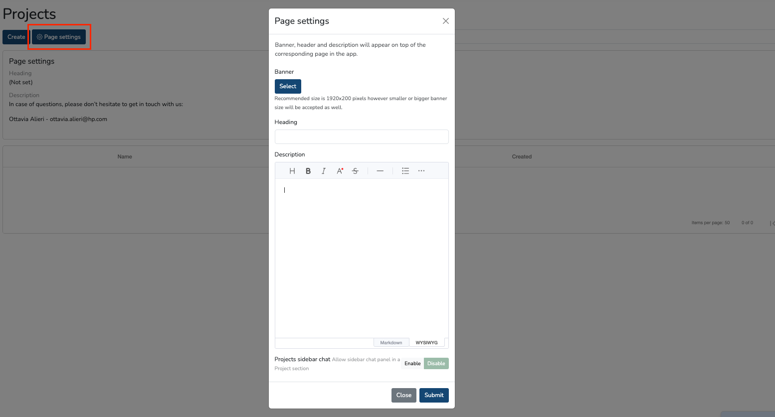 Users may also choose to edit the Page Settings to insert Banner photos, Heading and Description and toggle enable to allow sidebar chat panel in a Projects Page.