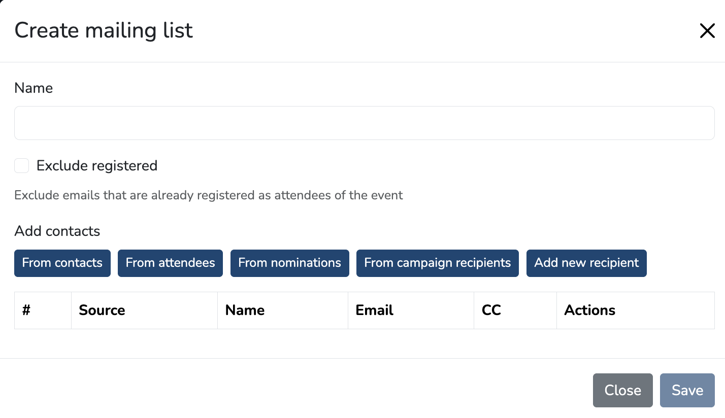 When importing a mailing list, you may also exclude registered attendees. The system will automatically exclude the email addresses of registered attendees. This is helpful when sending out invites to register for your event.