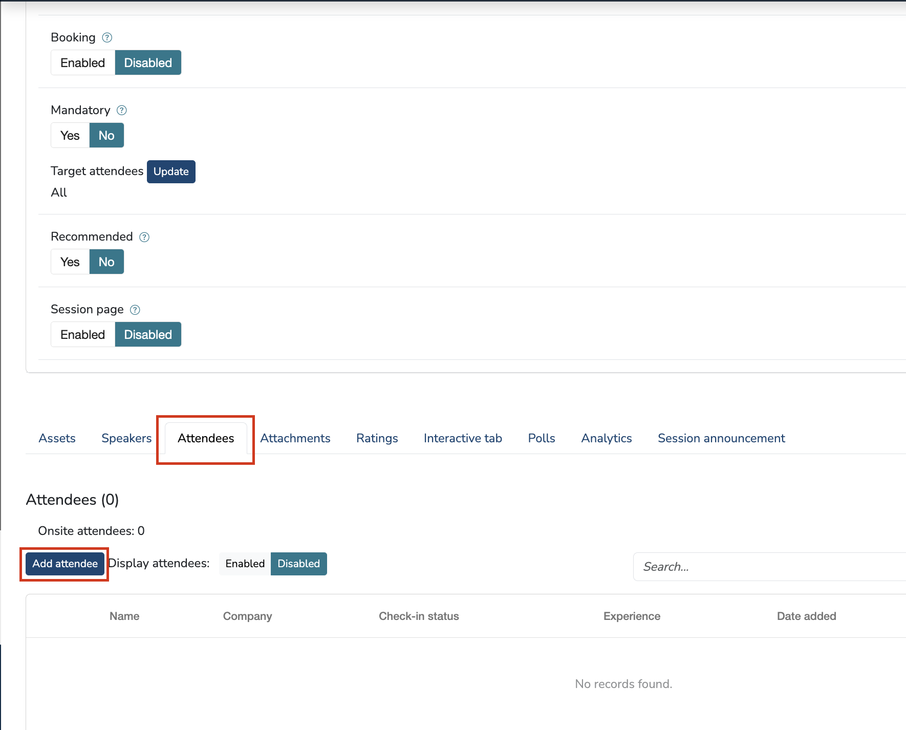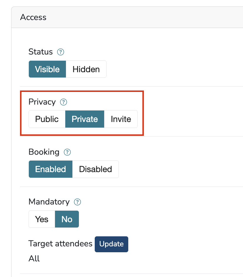 When a session is set to Private, it is only viewable to the attendees added under the Attendees tab. You can assign attendees to the session by scrolling down to the Attendees tab and selecting the individuals who should have access.