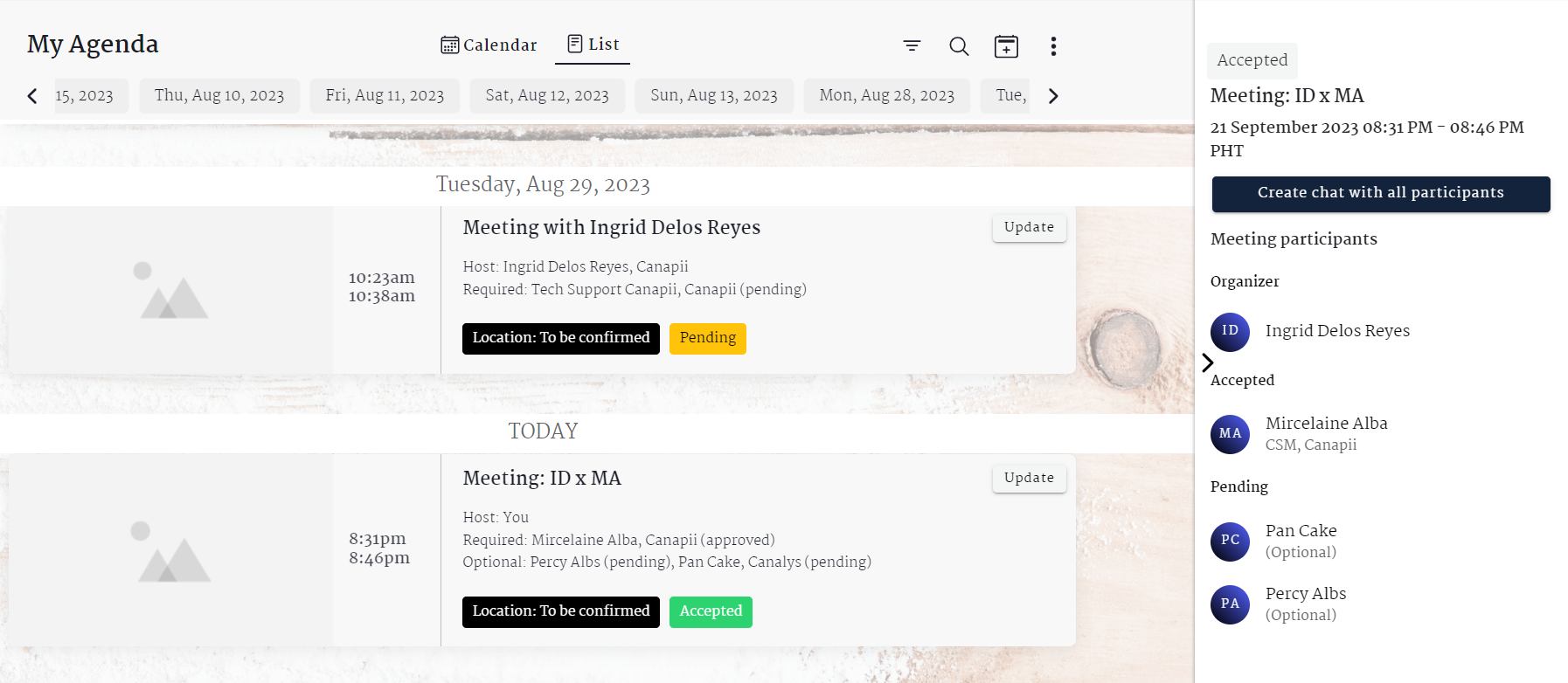 As the meeting host you will also have the option to update or cancel the meeting and create a chat will all meeting participants.