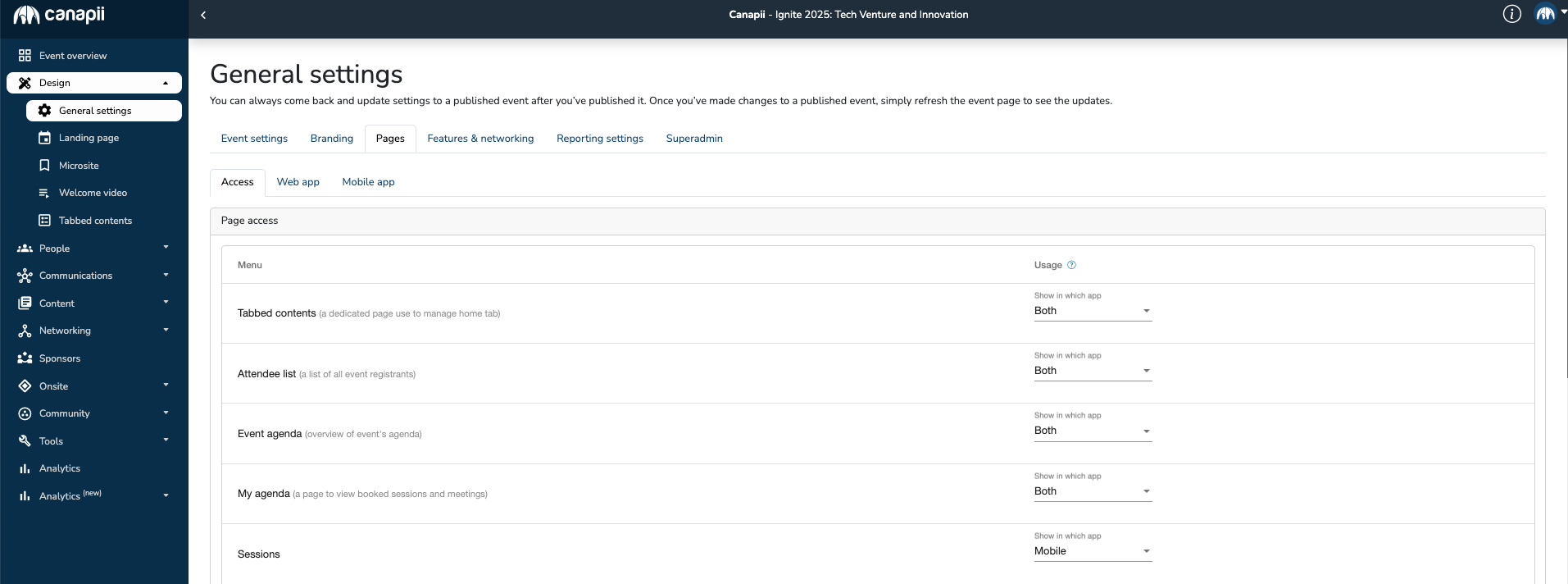 Under Access tab to manage the usage and access for your event platform pages. You may set each page if it is viewable or accessible for Mobile, Web, Both or Disabled.  Each option here corresponds to feature in the left-hand side bar where you can build out these pages further.