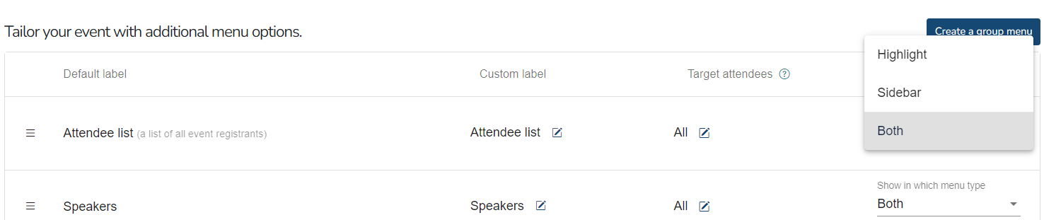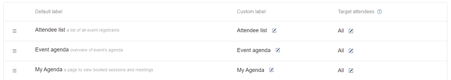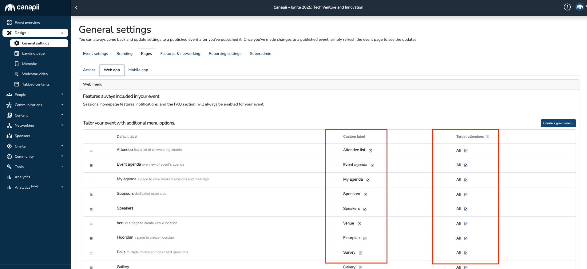 You may then click on Web app or Mobile app to customize and rename the menu options under Custom label column and target attendees which will allow admins to tailor the menu bar depending on the attendee type (ie: only specific attendee type can see a specific page)