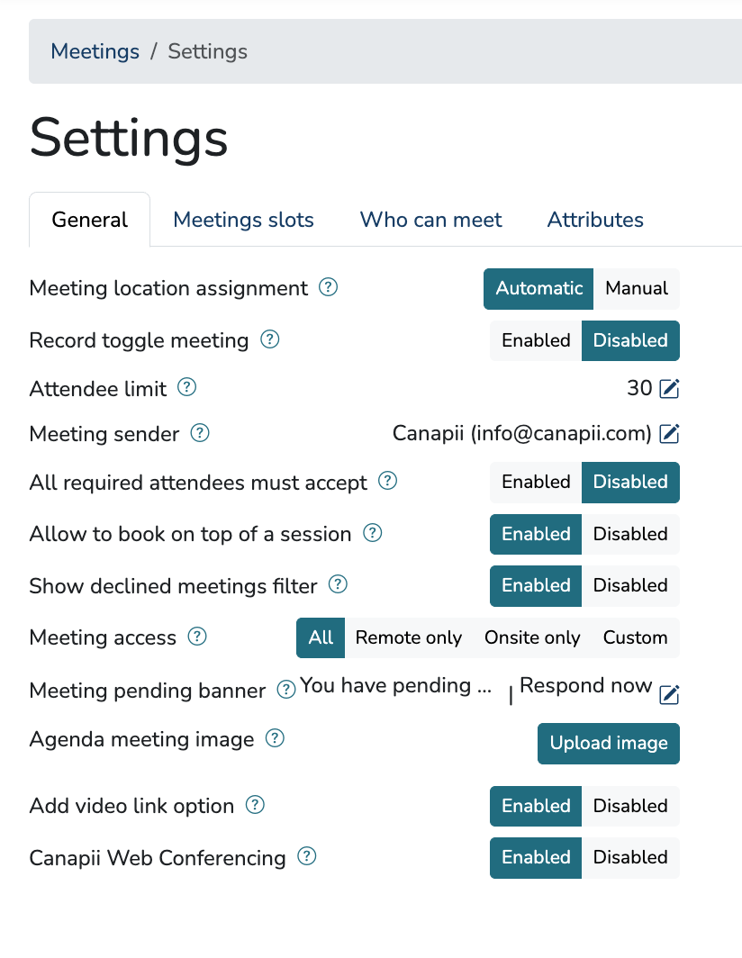 - Meeting sender- determine what email address will send meeting requests and notifications, by default it is info@canapii.com