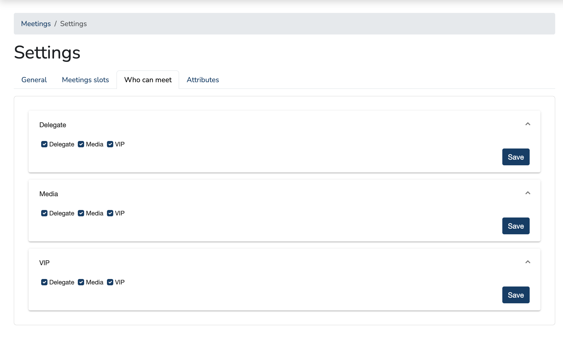 Admins can control who can meet based on attendee types. Attendees will only see the types they are allowed to meet with on their Attendees page.