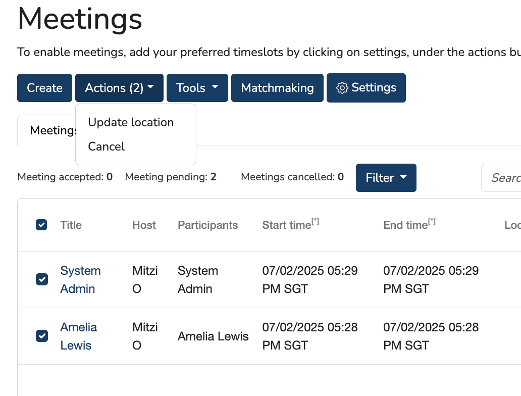 Users have the ability to edit or update the location of multiple meetings using the Actions feature. To use this function, check or tick the meetings that you’d like to update and select Actions > Update Location.