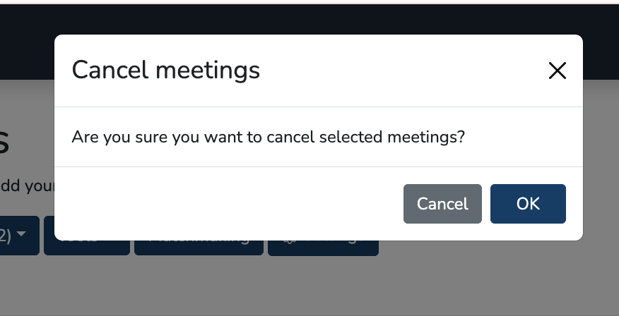 To cancel meetings in bulk, select the meetings, click Actions, choose Cancel.