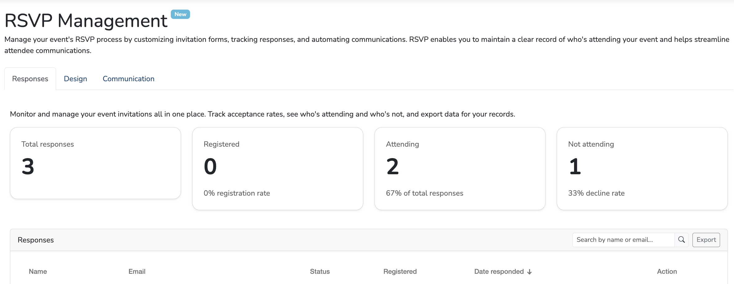 In the Responses tab, you’ll see a list of attendees who have either accepted or declined your RSVP invitation.