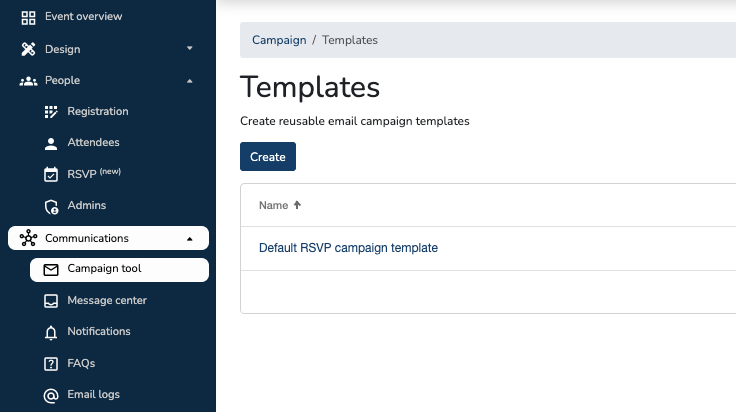 • Private – page only accessible via email campaigns and will have a unique link per attendee. A default RSVP campaign template will be automatically generated, which you can customize. You can view and edit this by going to the Communication tab > Campaign Tool > Templates.