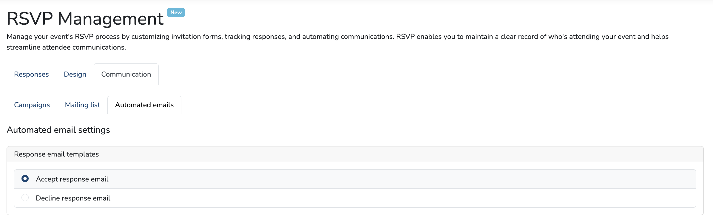 Attendees will receive an email based on their RSVP response, indicating whether they have accepted or declined. These emails are fully customizable.