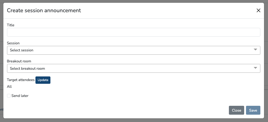 As an event admin, you’re able to push out session announcements & updates. To achieve this simply go into the session and scroll down to the bottom of the page. Here you’ll find a Session Announcement tab.