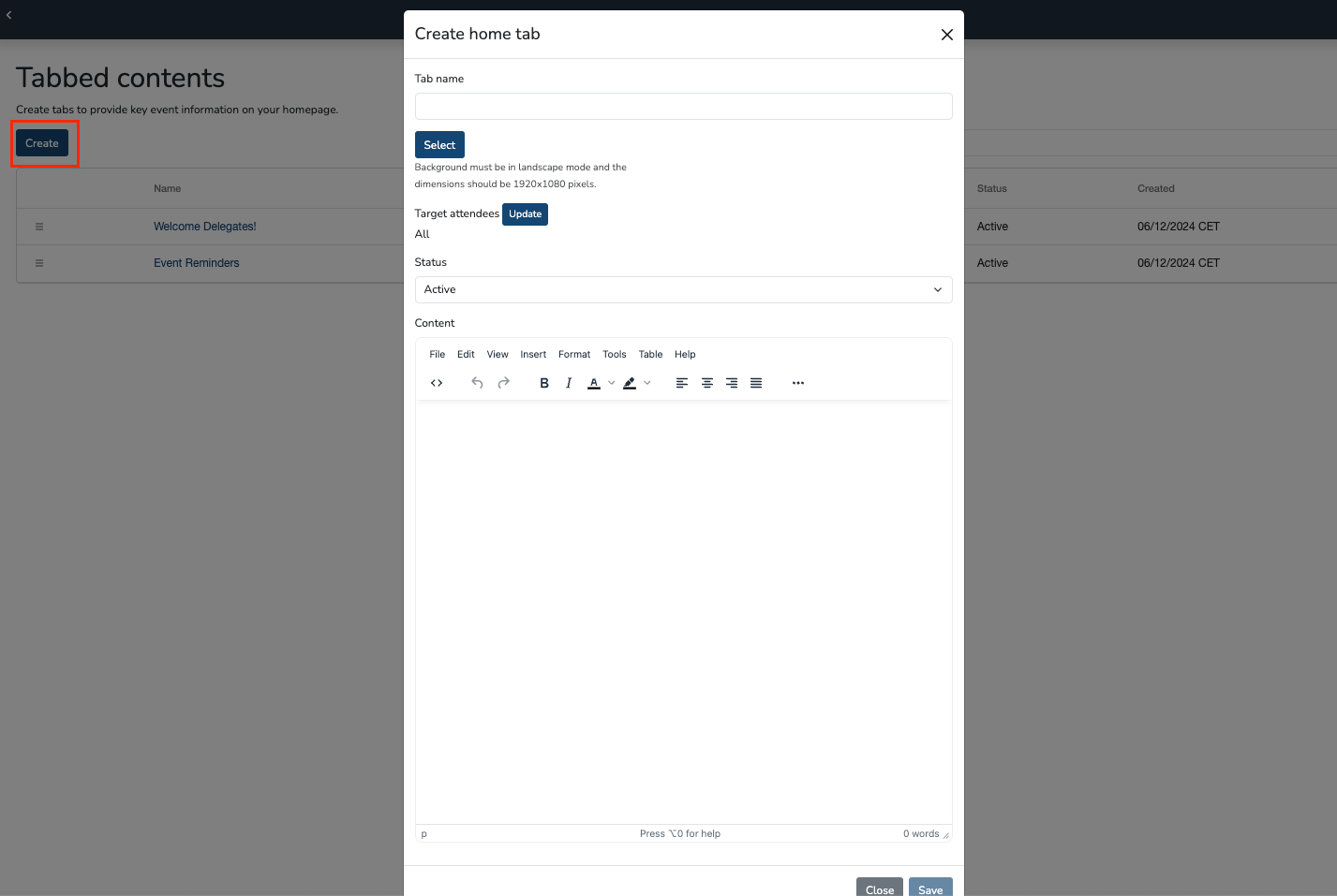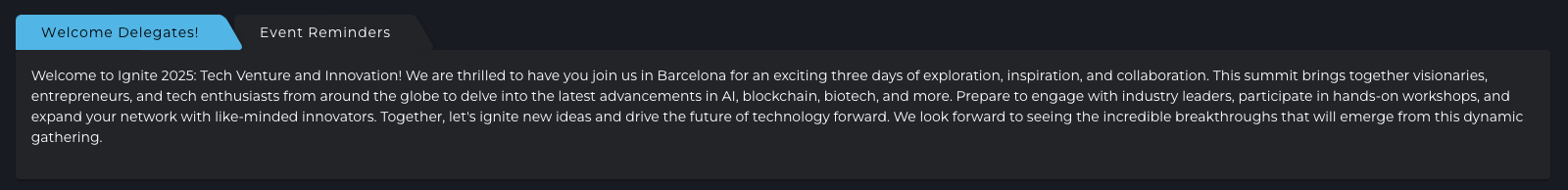 Tabbed contents feature is a great way to share key information with your audience i.e. Directions to an event, an events schedule, T&C’s, code of conduct or you could even include links to external resources.