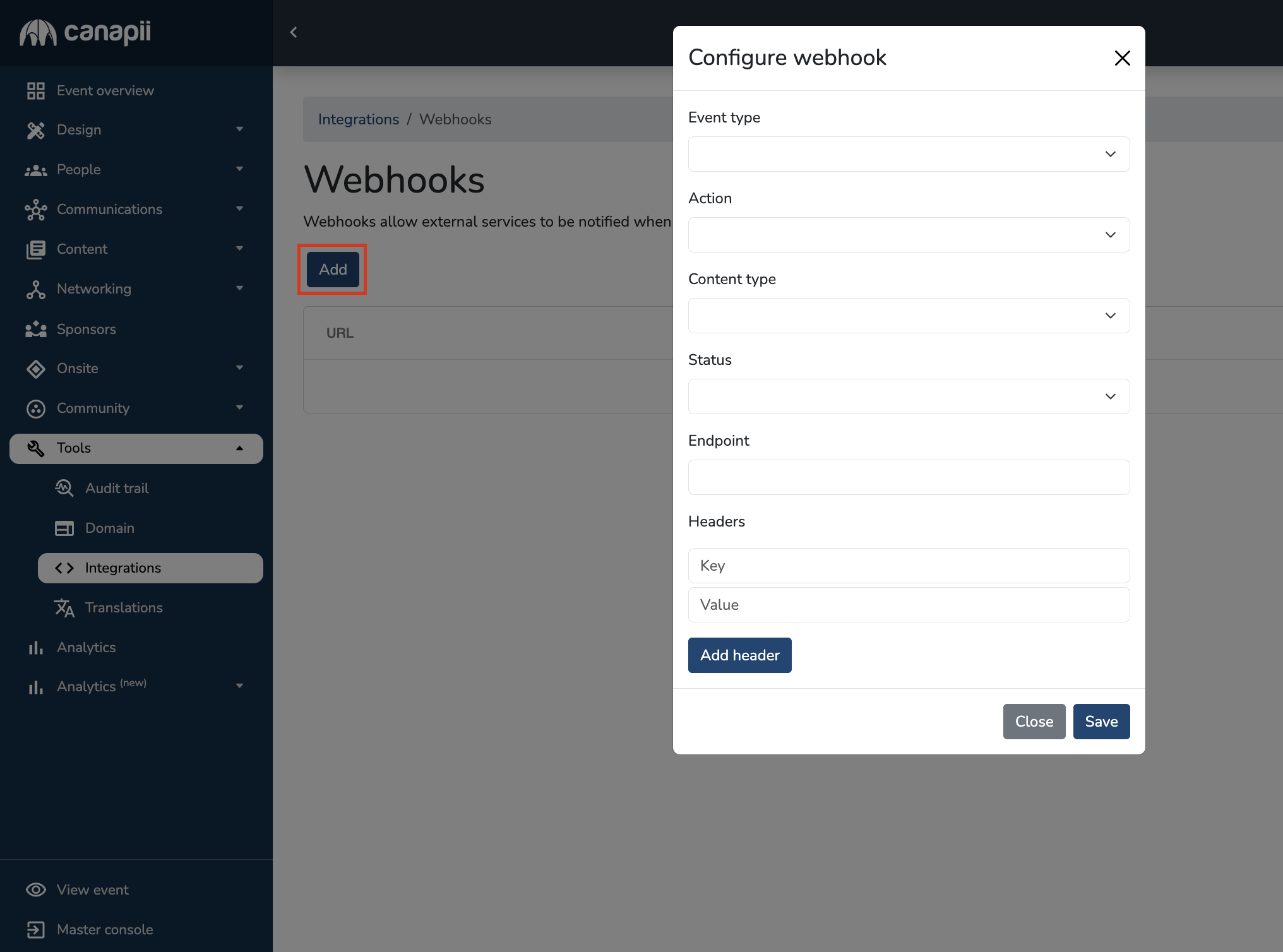 3. Click Add to set up your webhook connection
